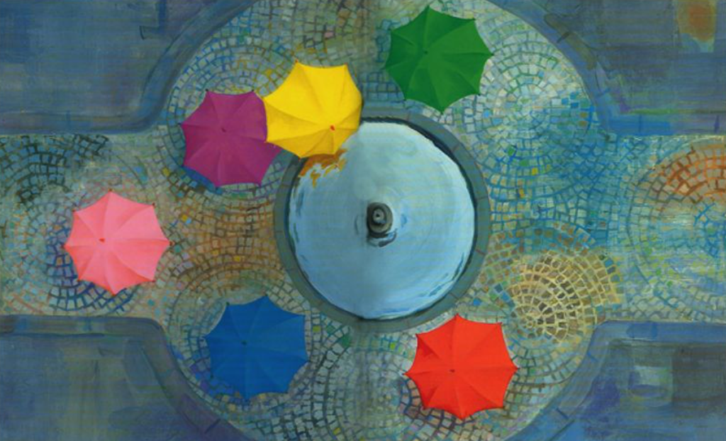 아이들이 우산을 들고 걷는 모습이 ‘움직이는 리듬’이 되어 책 속을 흐르고,