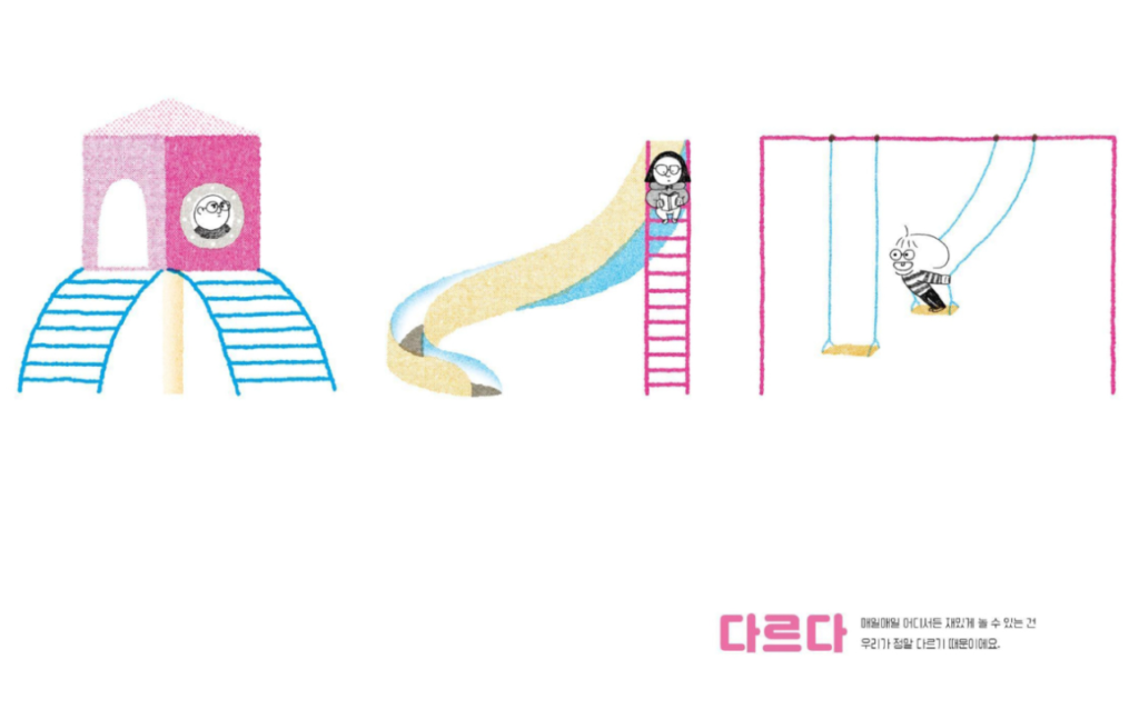 세 아이가 놀이터에서 만나 놀고, 다투고, 화해하고, 함께 아지트를 만드는 과정 속에 ‘나답다, 다르다, 다양하다, 나누다, 계속하다…’ 총 33개의 단어가 자연스럽게 스며 있습니다.